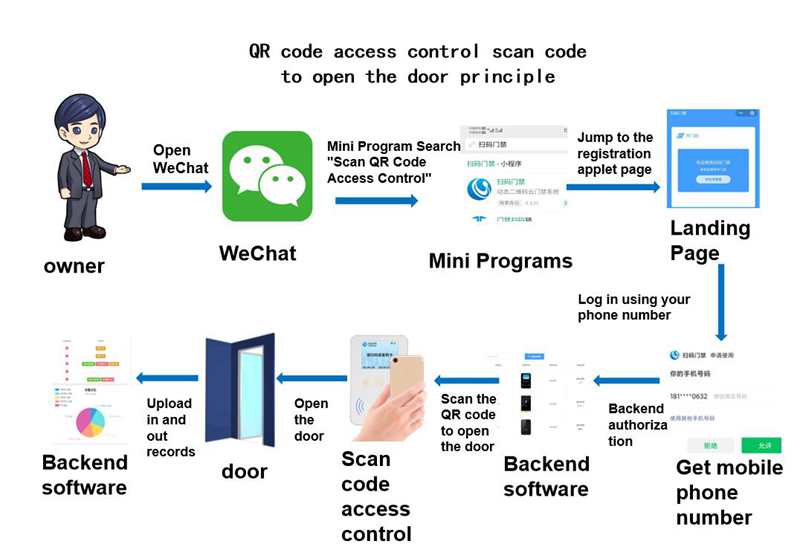 The working principle of QR code access control can be simply understood as: generating a dynamic QR code on a mobile phone APP or mini program through an encryption algorithm. After the user scans the code, the QR code access control transmits the data to the cloud server through the TCP/IP protocol, and the software background determines whether the permission of the door opening code is legal based on logic. If it is legal, a remote door opening command is issued, and if it is illegal, the door is refused to open.